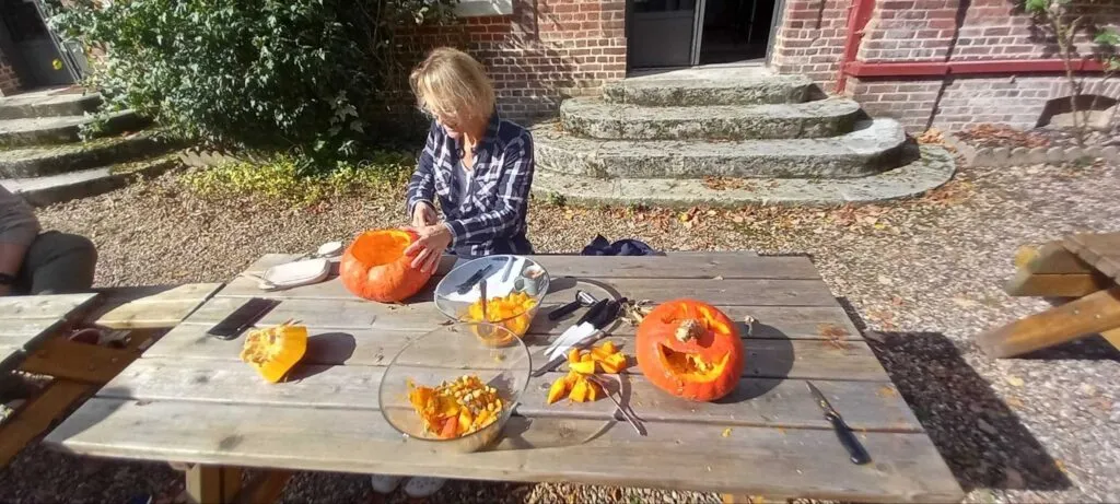 Première étape : la traditionnelle découpe de citrouilles ! Sous les derniers rayons de soleil d’octobre, on s’est installés dehors, armés de couteaux, de cuillères et d’un courage variable selon les participants. Certaines citrouilles sont devenues de véritables œuvres d’art… d’autres, des exceptions non gérées. 😅