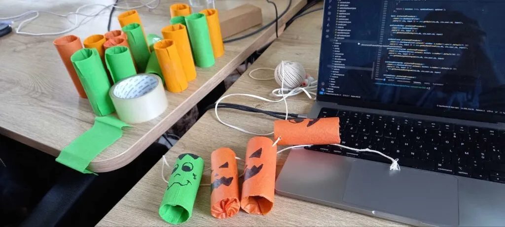 Place au recyclage créatif ! Rouleaux de papier toilette, chutes de papier coloré, un marqueur et un bout de ficelle plus tard. Et voilà une armée de petits fantômes, citrouilles, chauves-souris, autres créatures étranges prêtes à envahir le bureau. Certains personnages avaient l’air terrifiants, d’autres… un peu trop mignons pour faire peur. Mais l’ambiance spooky était au rendez-vous entre deux cafés et trois commits sur Lea English (dont vous pouvez lire l’étude de cas UX ici) !